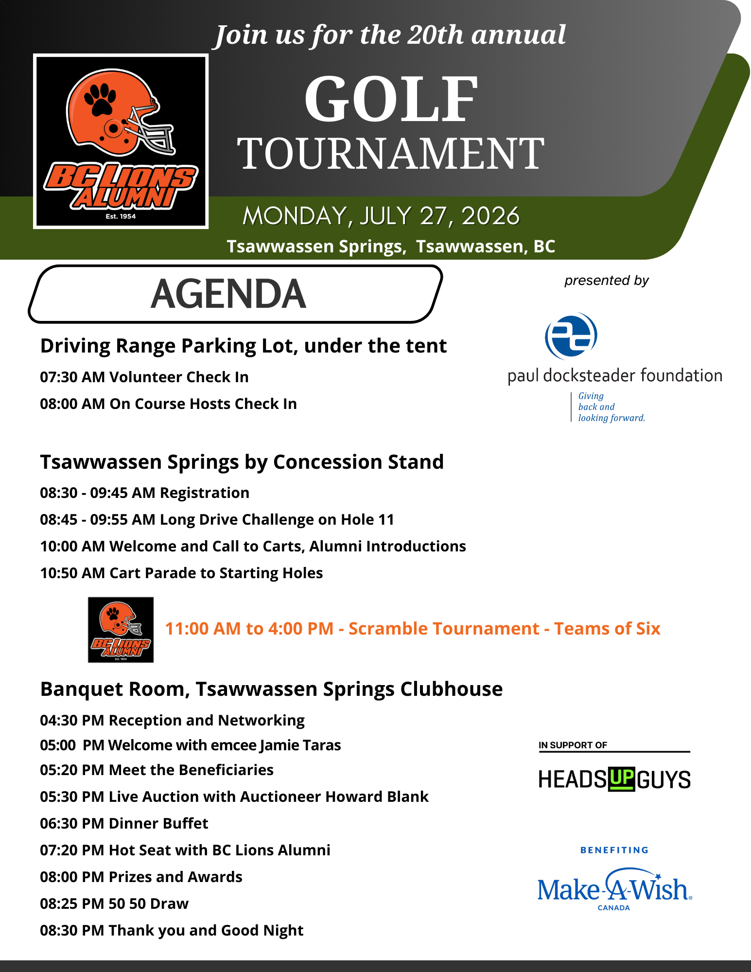 | 11:00 AM | Scramble Tournament | Tsawwassen Springs Golf Club |