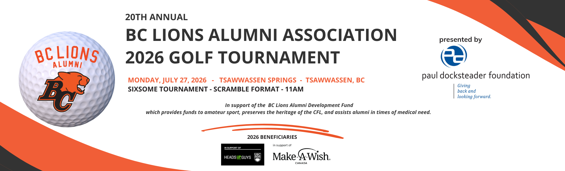 GOLFER INFORMATION:2026 finds us at the beautiful Tsawwassen Springs golf course, where 29 teams of six (6) golfers take to the links on July 27, 2026. https://www.tsawwassensprings.ca This fast paced and fun sixsome scramble format brings in low team scores. Six tee shots! Six chances of making that eagle putt. The drama. The laughs. The Groans. All included Foursome registration fees are $2000 plus four $25 gift cards, one for each golfer in your group. Early bird rates payable by April 30, 2026. Sponsor foursomes will be coupled with 2 BC Lions Alumni to complete the team of six (6). INCLUDES: 18 holes of golf, shared power cart, on course activities, food and beverage samples, Lunch kit sponsored by Big Star Sandwich, and buffet dinner PLUS, two tickets, per golfer, to a BC Lions game, red zone seating, dedicated section for the BCLAA golfers The $25 Gift Cards may be from any retailer – easy to use across BC (or Canada). The gift cards are divided into four (4) packages. Two lucky winners will each win back ¼ of the donated cards (by a draw). The other two packages start the live auction on Monday, July 27, 2026. Parking and Bag Drop Instructions: Drive into Tsawwassen Springs, free parking underground, park, bring clubs up to cart staging area, place golf clubs on your power cart. |